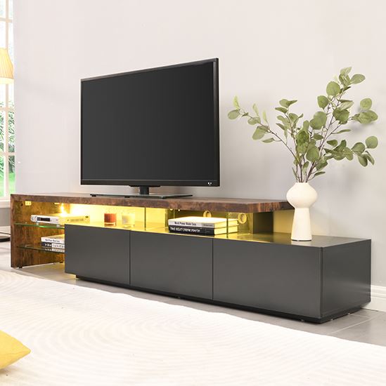 The Alanis Wooden TV Stand is a stylish and modern piece of furniture for your living room. Made from high-quality materials, it comes in a stunning Rustic Oak wooden finish and is accented by LED lights. This TV stand features ample storage space, with two spacious shelves and two soft-closing drawers. This makes it perfect for keeping your media devices and other items organized. The bright and reflective surface of the Wooden finish adds a touch of sophistication to your decor, while the LED lights provide a warm and inviting ambiance. Enhance your living space with the Furniture in Fashion Alanis Wooden TV Stand in Rustic Oak, a perfect blend of modern design and timeless elegance. Featuring a warm rustic oak finish, this stylish TV unit adds a natural charm to your decor while providing ample storage for your entertainment essentials. The integrated LED lighting creates a cosy ambiance, making your TV area the focal point of your home. The minimalist design of the Alanis Wooden TV Stand ensures it will blend seamlessly into any contemporary decor. Whether youand#39; re looking for a practical way to display your television or simply want to add some style to your living room, this TV stand is the perfect choice. FEATURES : Material : Tempered Glass, MDF Finish : Clear, Rustic Oak Surfaces are easy to care for as well as impact and scratch resistant Shelves : Tempered Clear Glass MDF E1 with Rustic Oak paper and dark grey melamine LED warm white light with UK plug Comes complete with 3 drawers for storage Max load capacity of top 40kg Use Damp cloth for cleaning Ideal for your living room A warm, natural look that complements various interior styles Built-in LED lights create a stylish and inviting atmosphere Multiple compartments for media devices, DVDs, and accessories Designed for long-lasting strength and stability Keeps wires organized for a clutter-free setup Available at an affordable price Images shown are for illustratio
