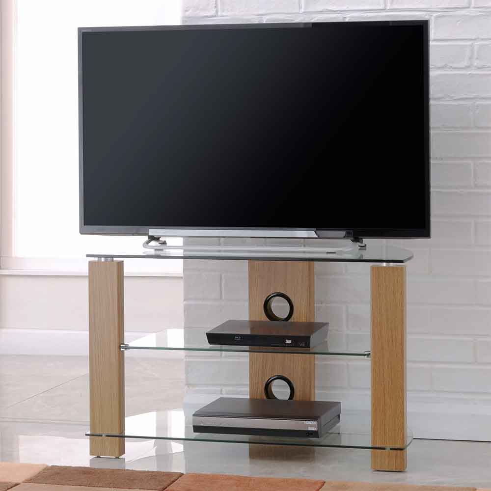 Enhance your living room or media corner with the Alpine 800mm Wooden Corner TV Stand Oak by Furniture in Fashion. This compact yet stylish stand combines a wood-effect oak finish with clear, toughened glass shelving to deliver a modern, minimalist aesthetic that complements a wide range of interiors. Designed for apartments, smaller living rooms, or secondary entertainment areas, it brings together style and practicality. Whether youre streaming movies, gaming, or simply watching TV, this stand offers a stable, attractive base for your screen while providing neatly organised storage for all your AV devices. With integrated cable management, open shelves, and a clean design, the stand ensures your entertainment setup stays tidy and elegant. FEATURES : Material : Wooden, Glass Finish : Oak The 800 mm size makes it suitable for TVs up to about 49 inches, Ideal for medium-size rooms or smaller spaces Features multiple clear, curved glass shelves for storing set-top boxes, consoles, DVD/Blu-ray players, soundbars, or gaming gear, combining durability with a sleek, modern look The top glass shelf can hold heavy TVs and devices; middle and bottom shelves are rated for lighter equipment, giving flexibility for various media components The open-shelf design makes it convenient to reach DVD players, game consoles or cable boxes without the need for doors, perfect for frequent use The oak-effect wood finish adds warmth and elegance, making the stand blend seamlessly with contemporary and classic decor alike A rear cable-management leg helps conceal wires and cables, giving your media unit a neat, professional look without visible clutter The 800mm width and open-plan design make it suitable for apartments, bedrooms, guest rooms, or smaller living rooms where space is limited With multiple shelves, you get ample room for a variety of AV devices, making it a flexible entertainment hub The blend of wood-effect legs and glass shelves gives a clean contempor