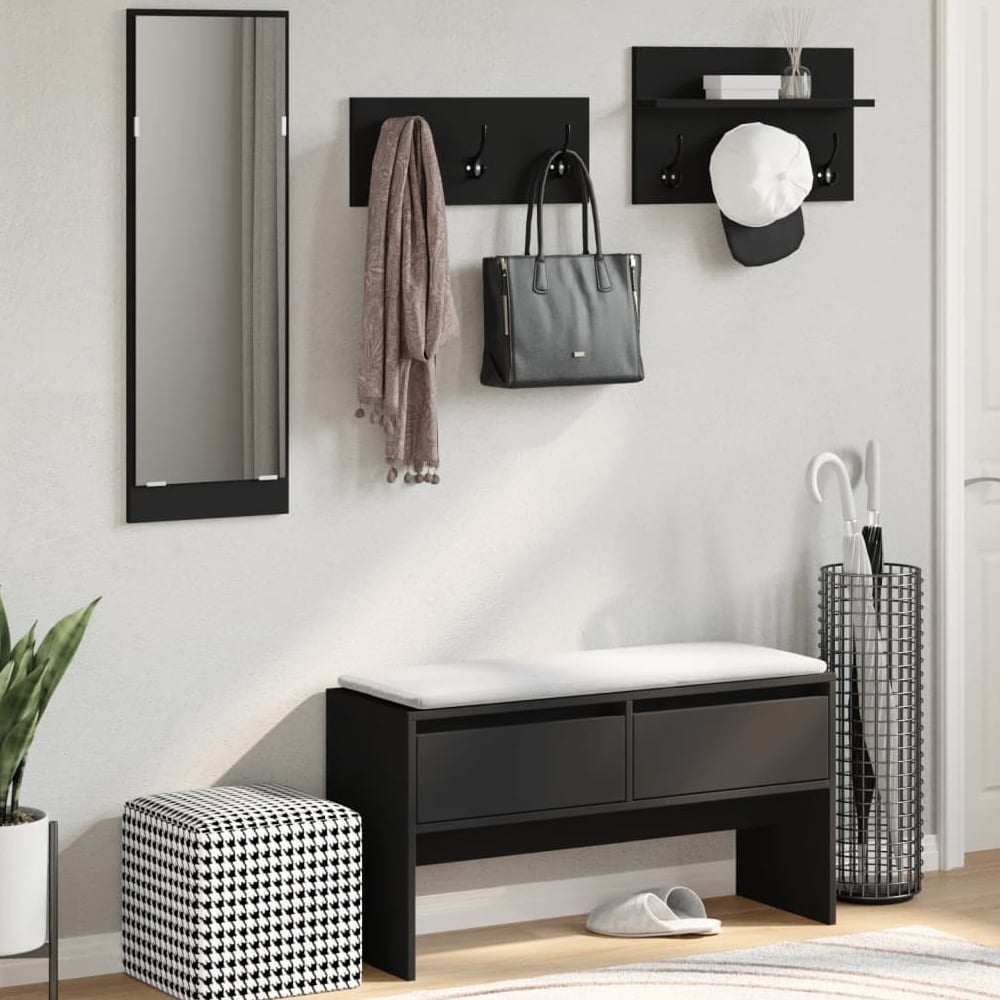 Transform your entryway with the sophisticated and functional Hamel Wooden 4 Piece Hallway Furniture Set in Black from Furniture in Fashion. This comprehensive set is designed to provide ample storage and a cohesive aesthetic to your hallway, making it both practical and stylish. Perfect for organizing your space, this set includes all the essentials to keep your hallway tidy and inviting. Crafted with precision and care, the Hamel Wooden 4 Piece Hallway Furniture Set boasts a clean, modern design that complements any interior decor. The Black finish adds a touch of elegance and brightness to your home, while the high-quality materials ensure durability and longevity. Whether you need a place to hang your coats, store your shoes, or display decorative items, this set has you covered. Enhance your hallway with the Hamel Wooden 4 Piece Hallway Furniture Set in Black from Furniture in Fashion. Enjoy a well-organized, stylish, and welcoming entryway that sets the tone for the rest of your home. FEATURES : Material : Engineered Wood, Galvanised Iron, Acrylic Finish : Black Create a warm and welcoming environment next to your door with this hallway furniture set Engineered wood is a durable and stable material with a smooth surface that is resistant to moisture, warping, and splitting, making it a reliable choice for a variety of projects This set has everything you need to keep your entryway neat and tidy It includes a shoe bench with drawers, a mirror, and two coat racks for storing shoes, coats, and accessories This versatile bench serves a dual purpose as a storage cabinet for shoes and accessories and as a convenient spot in the hallway for putting on or taking off your shoes 6 hanging options : The 6 hooks are placed at two different heights to be accessible to everyone and accommodate items of varying lengths Space saving : The wall-mounted design maximises unused wall space, converting it into a compact and efficient storage area, making this fur