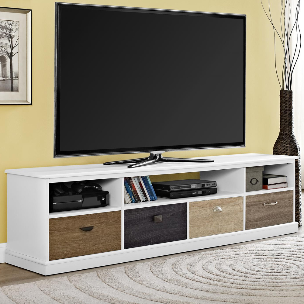 Bring elegance and functionality to your living room with the Maraca Large Wooden TV Stand With 4 Drawers in White from Furniture in Fashion. Designed with a clean, modern aesthetic, this spacious TV unit is perfect for creating a sleek and organized entertainment space. The crisp white finish adds a fresh and contemporary touch, making it a versatile addition to any interior decor. With ample storage and a sturdy design, the Maraca TV stand easily accommodates large flat-screen TVs while offering four generous drawers to keep media accessories, remotes, and cables neatly tucked away. The wide surface and minimalist profile make it ideal for both display and practical useperfect for modern homes seeking a balance of style and function. Stylish, spacious, and practical, the Furniture in Fashion Maraca Large Wooden TV Stand With 4 Drawers in White is the perfect centrepiece for any modern entertainment area. Upgrade your home with a piece that blends design and functionality effortlessly. FEATURES : Material : Wooden Finish : White Spruce up your living room with the Wood Home Maraca TV Console with Multi-coloured Drawer Fronts Featuring 4 drawers that are each finished in a different woodgrain and colour, this unique TV Console will be the centrepiece of your room The drawer fronts also feature 4 different knobs that are interchangeable for a one of a kind design, or change the order of the drawer fronts for even more creative control This TV Console accommodates up to a 65 flat screen TV with a maximum weight of 120 lbs The concealed drawers and open cubbies allow you to store all your entertainment components in one spot The classic white finish paired with the multi-coloured drawer fronts make this TV Console more than just a place to keep your belongings, its a conversation starter Bring an artistic accent to your living room or family room with the Wood Home Maraca TV Console with Multi-coloured Drawer Fronts for flat panelled TVs up to 65